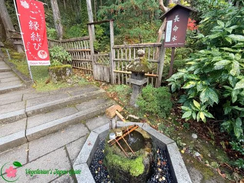 As you follow the approach and proceed further to the main hall, you will walk past a water fountain called Chōmeisui (長命水). Drinking the water from the fountain is said to prolong your life. Whether the legend is true or not, the water is delicious (^_-)-☆.